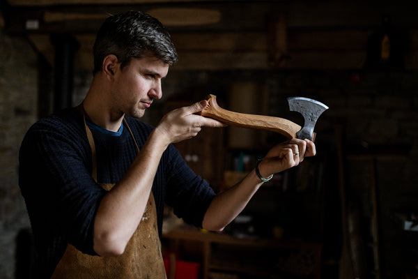 “Our tools allow us to create beautiful objects out of raw materials. These tools should serve us as reliable companions, an extension of our body. That was my aim when I made my axes. Perfect ergonomics, excellent quality steel and heat treatment. From the skill of the blacksmith, hand forging the heads, through my many years of experience with woodwork to the last stitches in the thick leather sheath, everything is an essential part of creating something that will outlast our generation. I want to create a tool which will be handed down to the next generation with a patina on the handle that can only be achieved through years of use”