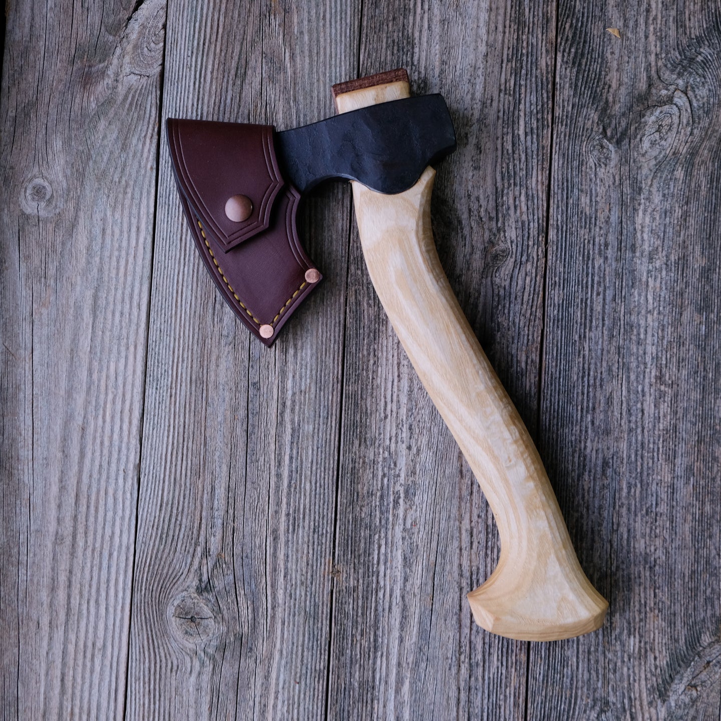 The hand-stitched thick vegetable tanned leather sheath with added stamp work is custom made for each axe, so they fit perfectly and protect the razor sharp edge. Additionally the corners are reinforced with copper rivets to guarantee the longevity of the sheath so it can protect the razor sharp edge.