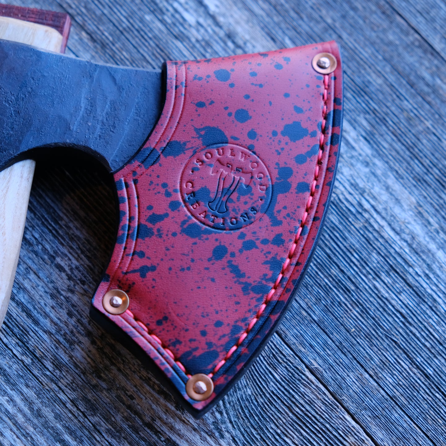 The hand-stitched thick vegetable tanned leather sheath with added stamp work is custom made for each axe, so they fit perfectly and protect the razor sharp edge. Additionally the corners are reinforced with copper rivets to guarantee the longevity of the sheath so it can protect the razor sharp edge.