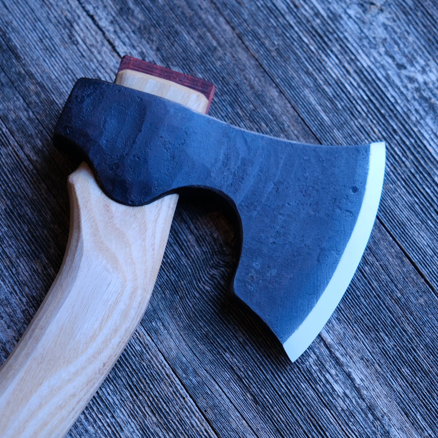 This carving axe was designed with ergonomics and functionality in mind. The traditional bearded head profile, and the faceted re-curved handle makes it an ideal carving axe. I have added some milk paint to make it truly stand out.