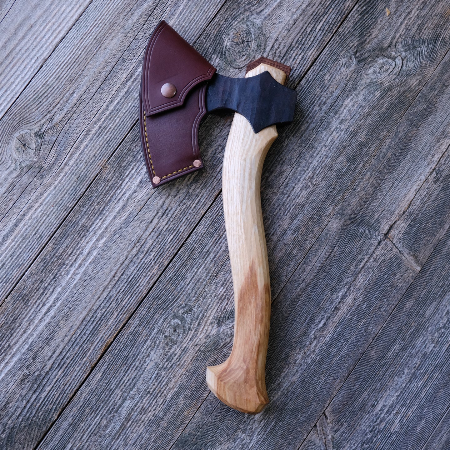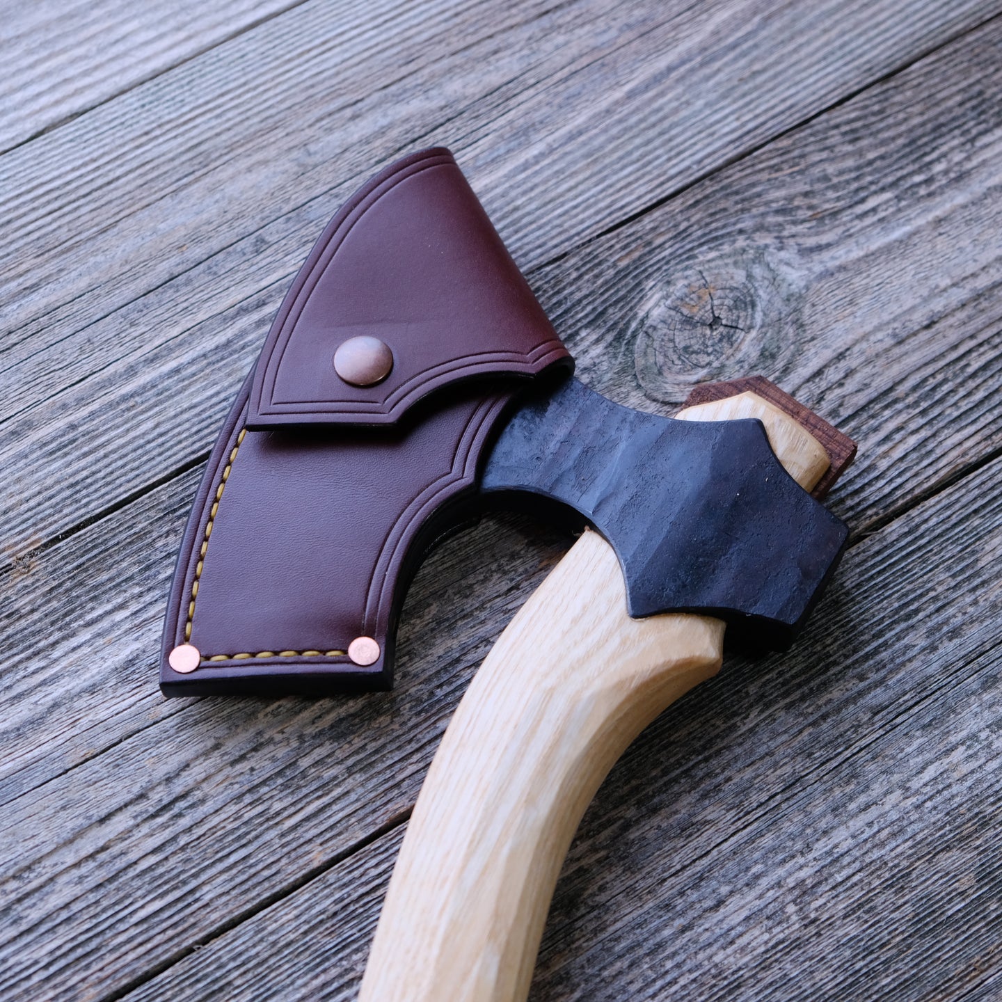 The hand-stitched thick veg tanned leather sheath is custom made for each axe, so they fit perfectly and protect the razor sharp edge.