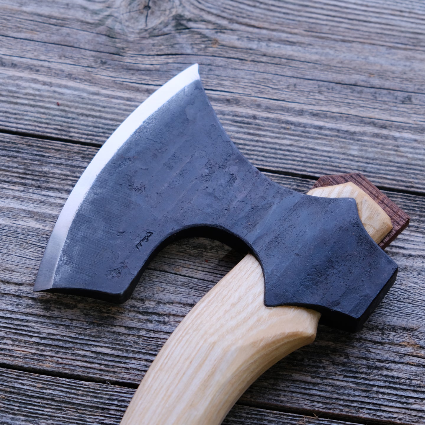 This carving axe was designed with ergonomics and functionality in mind. The traditional bearded head profile, and the faceted re-curved handle makes it an ideal light weight carving axe. Hand forged from a solid piece of spring steel in Hungary by a blacksmith with more than 30 years of experience.