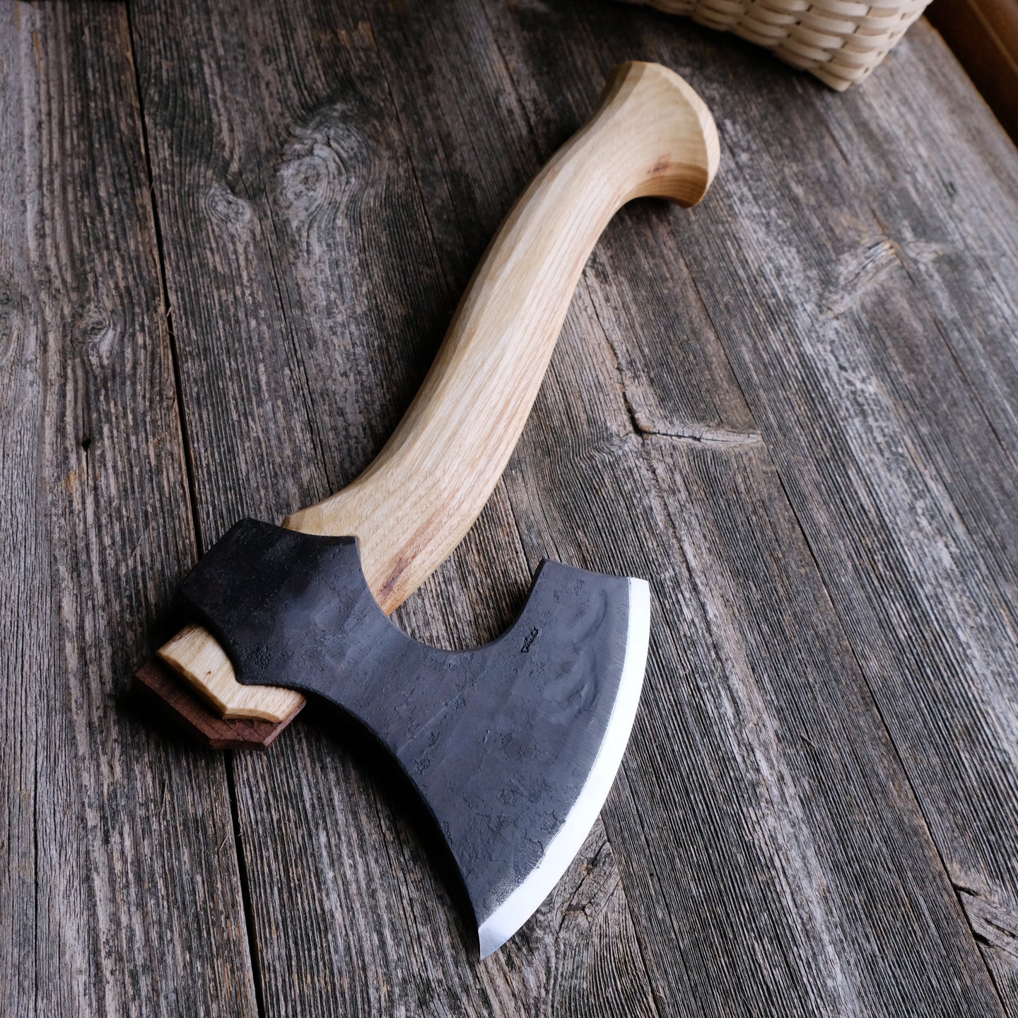 This carving axe was designed with ergonomics and functionality in mind. The traditional bearded head profile, and the faceted re-curved handle makes it an ideal light weight carving axe. Hand forged from a solid piece of spring steel in Hungary by a blacksmith with more than 30 years of experience.