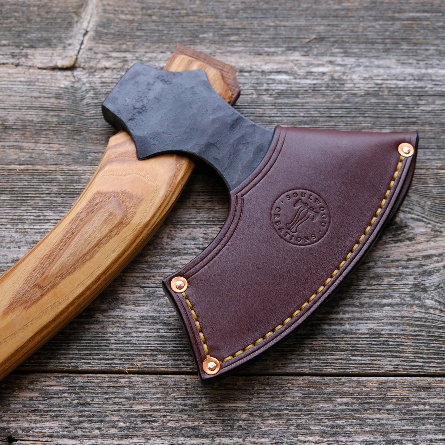 The hand-stitched thick veg tanned leather sheath is custom made for each axe, so they fit perfectly and protect the razor sharp edge.