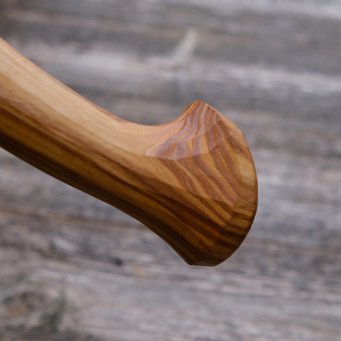 Features a faceted hand carved English olive-ash handle. The facets improves the grip on the axe, which means you can use your axe longer without getting blisters or fatiguing your hand.
