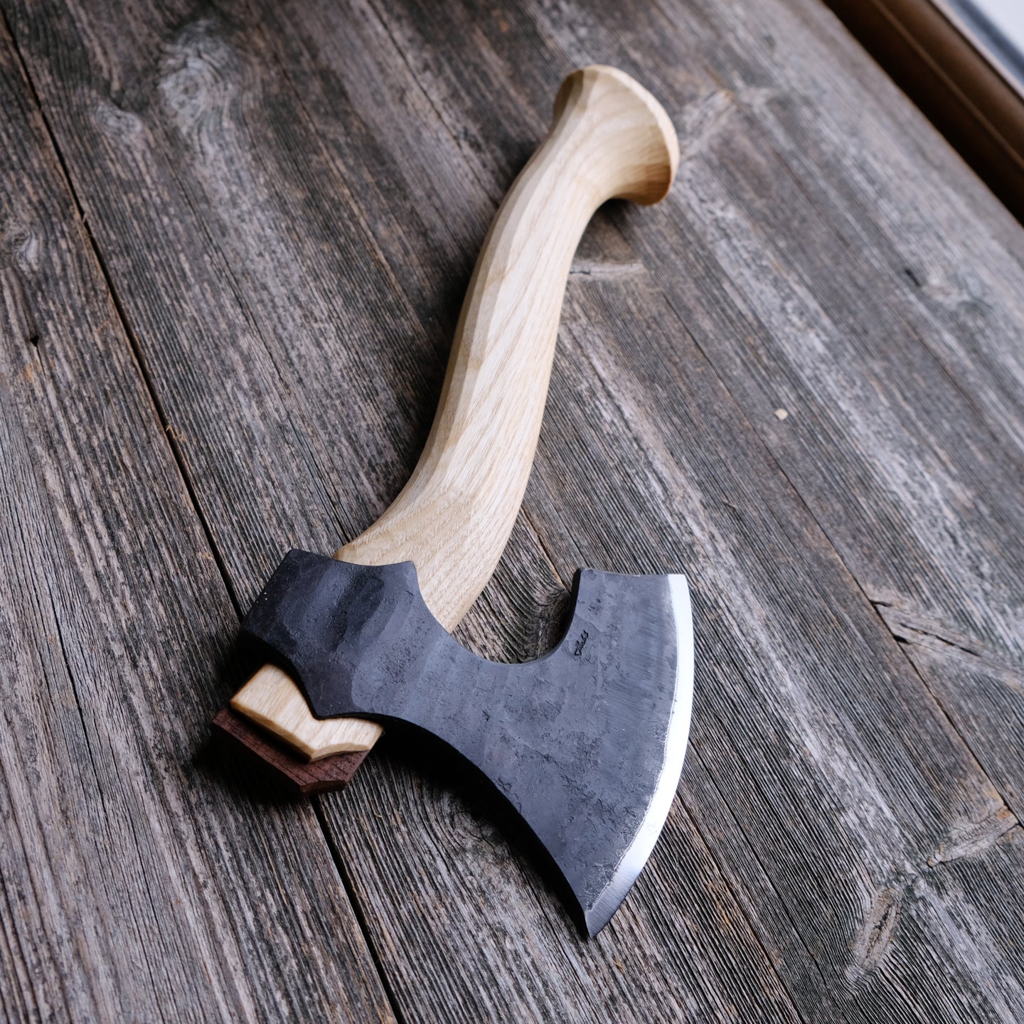 This carving axe was designed with ergonomics and functionality in mind. The traditional bearded head profile, and the faceted re-curved handle makes it an ideal light weight carving axe. Hand forged from a solid piece of spring steel in Hungary by a blacksmith with more than 30 years of experience.