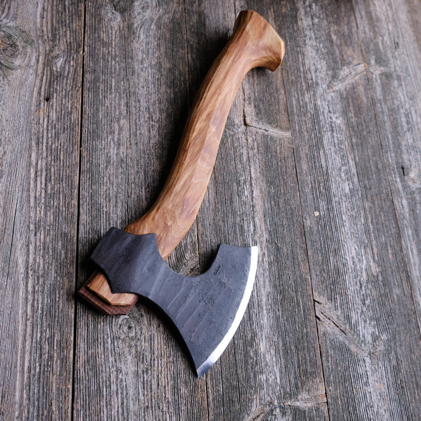 This carving axe was designed with ergonomics and functionality in mind. The traditional bearded head profile, and the faceted re-curved handle makes it an ideal light weight carving axe. Hand forged from a solid piece of spring steel in Hungary by a blacksmith with more than 30 years of experience.