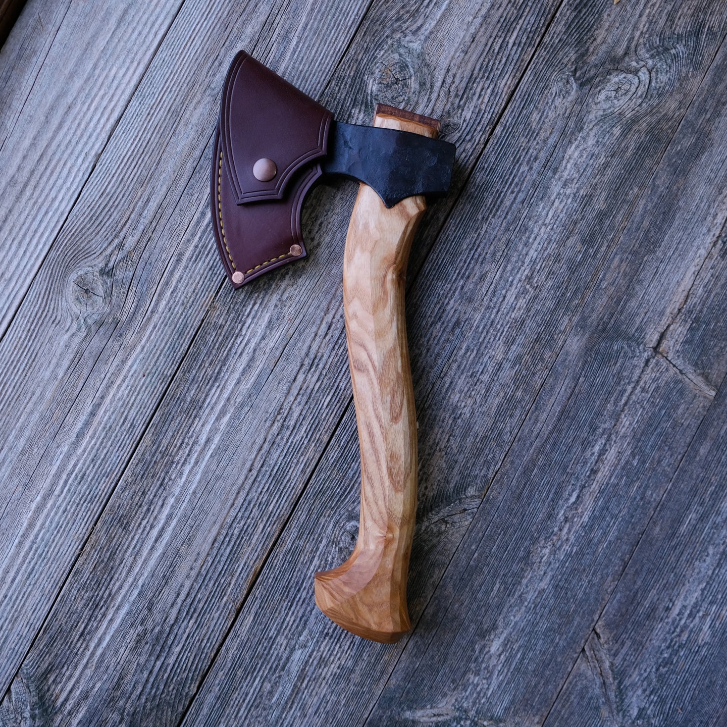 The hand-stitched thick vegetable tanned leather sheath is custom made for each axe, so they fit perfectly and protect the razor sharp edge.